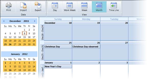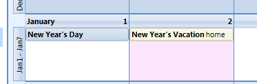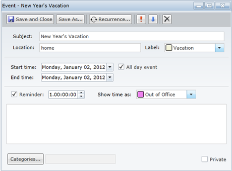 In the default Month view, double-click a date to add an event to the holiday schedule. In the Event dialog box, add a Subject, Location, Label, Start and End time, or anything else you would like to assign to the event.