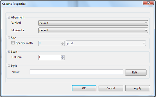 | C1Editor Run-Time Elements > C1Editor Dialog Boxes > Table Properties Dialog Box > Column Properties |