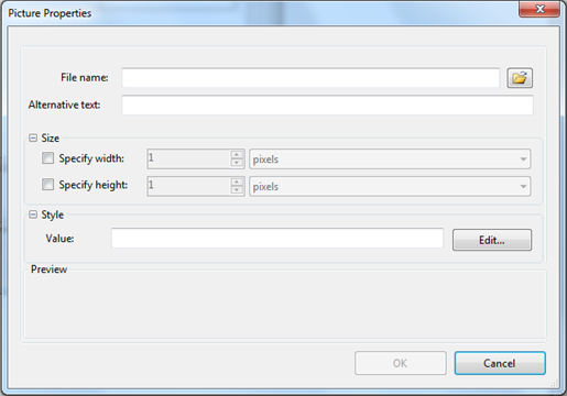 Users can insert and preview a picture using the Picture Properties dialog box.