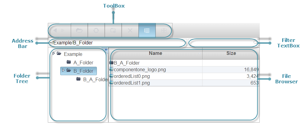 The following illustration shows the visible controls in the FileExplorer.