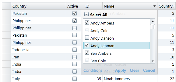 A grid containing several thousand items may have a unique ID column, which adds too many items to the Value filter, making it slow and not very useful. In this case, disable the Value filter by setting the FilterType property to Condition.