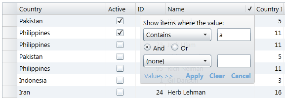 Once filtering is enabled, the grid displays a drop-down icon when the mouse is over the column headers. The drop-down shows an editor that allows users to specify how to filter the data on the column. Users may choose between two types of filter: