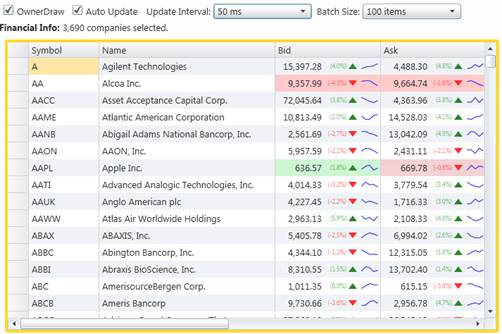 This section describes a sample financial application with real-time data updates, flashing cells, and sparklines. The sample highlights the performance that the C1FlexGrid provides both in Silverlight and in WPF.