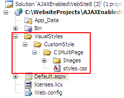To add a custom visual style to a Studio for ASP.NET control (see Available Visual Styles a list of available visual styles), you will have to add the .css file and images you used to your Visual Studio Web project. These instructions illustrate the process of adding a custom visual style using the C1MultiPage control as an example.