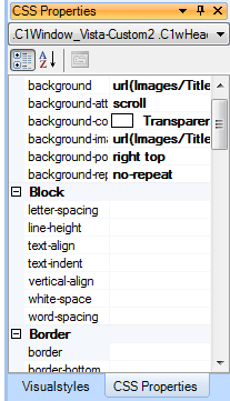 The CSS Properties pane is similar to the Properties window in Visual Studio. The CSS Properties pane includes all possible editable CSS options within a grid. To use the CSS Properties pane to modify a theme, create a custom theme, select the control part you wish to modify, and then use the CSS Properties pane to modify the CSS properties.