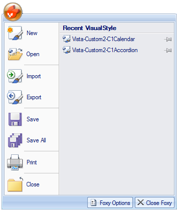 At the bottom of the menu are two buttons, Foxy Options and Close Foxy. Clicking Foxy Options will open a start dialog box that allows you to edit application options. Clicking Close Foxy will close the application menu.