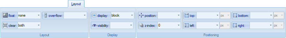 The Layout tab contains three groups: Layout, Display, and Positioning. From this tab, you can set properties pertaining to the background of your selected element. The Layout tab appears as follows: