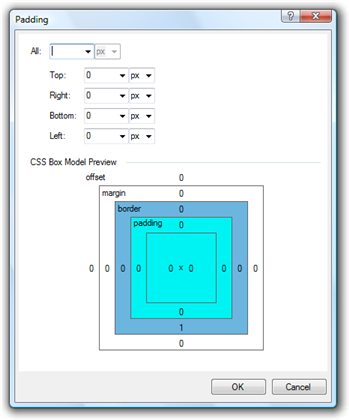 The Border dialog box enables you to specify the width of the padding for the CSS box model. There are five rows in the Border dialog box – All, Top, Right, Bottom, and Left – and each row represents an area of the box. Each row allows you to set the width of a specific area in the box. For example, setting the property in the All row will apply the setting to every area of the box, whereas setting the property in the Top row will only add that padding setting to the top area of the box.