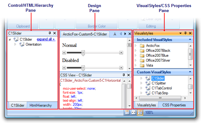 Foxy for ASP.NET contains three dockable panes: the control pane, the design pane, and the VisualStyles/CSS Properties pane. The third pane, VisualStyles/CSS Properties, is actually two panes in one: it defaults to the VisualStyles pane but can be switched to the CSS Properties pane by clicking the CSS Properties tab at the bottom of the pane.
