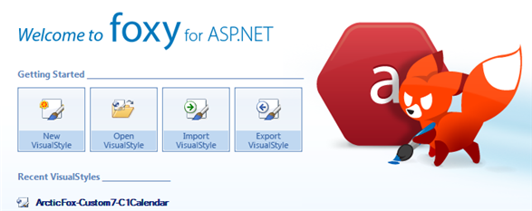 There are four buttons under Getting Started: New VisualStyle, Open VisualStyle, Import VisualStyle, and Export VisualStyle. These commands, which also appear under the Foxy for ASP.NET button, launch dialogs that are used to create and move visual styles.