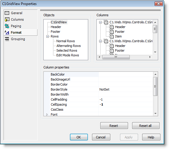 The Format tab of the Property builder allows you to set the font, color and alignment of the grid and everything within it, including the headers, footers, the pager, specific items, and columns. The Format tab includes the Objects, Columns, and Column properties sections: