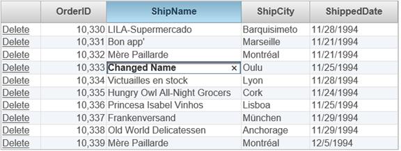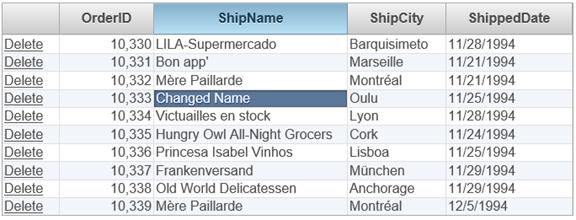 Run the project and see that the edited data value is updated on the server. You can also delete a row and update the grid with the changes.