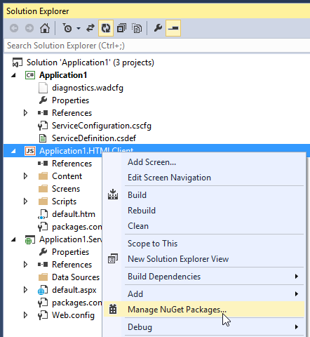 For the ComponentOne controls and screens to work at runtime, you need to install NuGet packages into each HTML Client project. To begin, upgrade the NuGet Package Manager to version 2.5 or above. For more information, see the NuGet Package Manager for Visual Studio 2013 Extension.