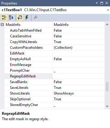 You can use regular expressions in masks for validating more complex input formats using RegexpEditMask. The Properties pane showing RegexpEditMask property for c1TextBox control is as shown: