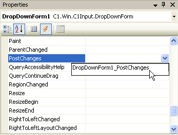 Select the form class name (for this example, WindowsApplication1.DropDownForm1) in the DropDownFormClassName property of your C1DropDownControl. Notice that when you run the project and select the drop-down arrow, the drop-down form now appears.