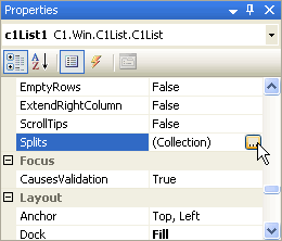 You can access the Split Collection Editor by clicking the ellipsis button (...) next to the Splits property. This editor can be used to access all of the split-specific properties, as well as the C1DisplayColumnCollection properties for the current split. For more information, see Using the Split Collection Editor.
