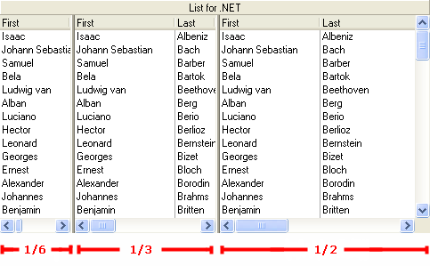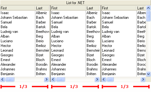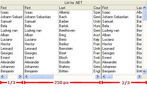 List for WinForms gives you full control over the size and scaling of individual splits. You can configure a split to occupy an exact width or height, hold a fixed number of columns or rows, or adjust its size proportionally in relation to other splits. If you are just starting out with List for WinForms, you can use splits in a variety of ways without having to master all of the details.