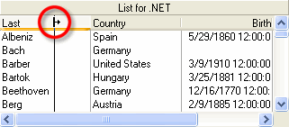 If the user drags the pointer all the way to the left, the column retains its original Width property setting, but its Visible property is set to False. To make the column visible again, the user can point to the right side of the divider of the column that preceded it. The pointer turns into a vertical bar with a right arrow.