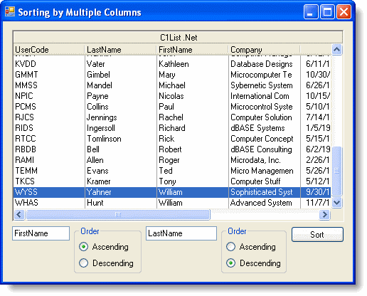 You can now enter column names into the textboxes and choose the sort order. Notice how choosing different orders on the columns changes the order of the data, in this case William Yahner appears before William Hunt because the LastName column is set to descending order.