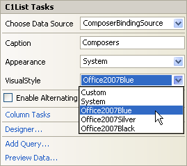 In the previous steps you've added the C1List control to the form and bound the C1List control to a data source. In this step you will customize the C1List control's appearance settings. Complete the following steps: