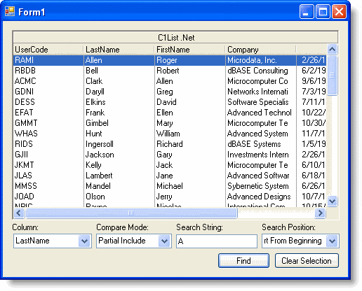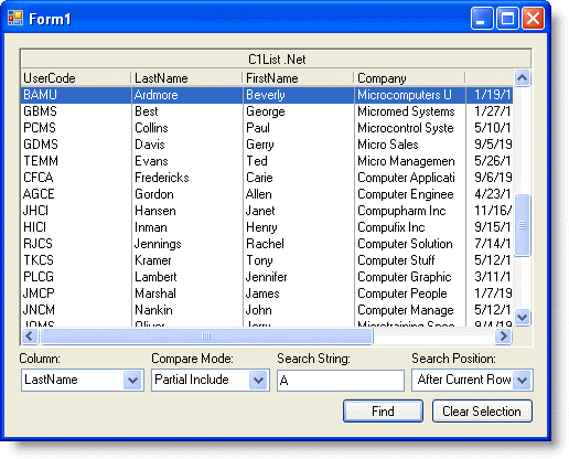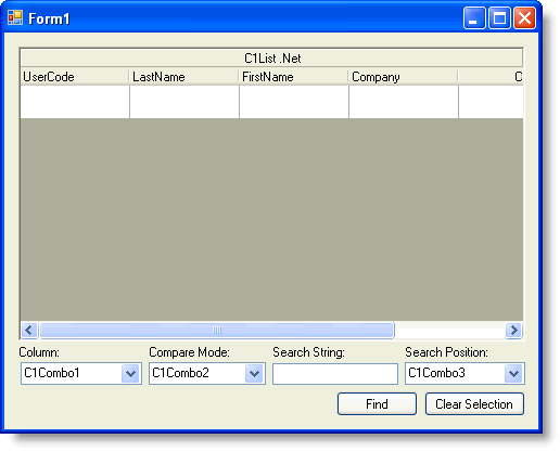In this tutorial you will utilize the Find method in C1List. The Find method allows you to perform custom searches within the control.