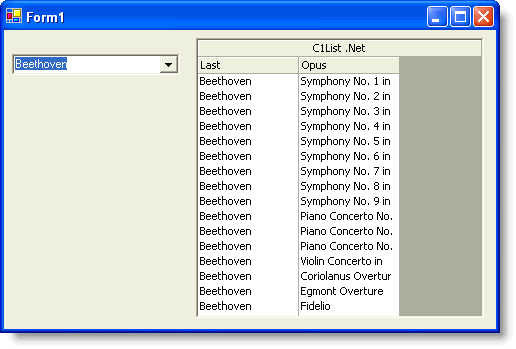 Change the current record position of dbcComp by selecting a different composer. Observe that dblOpus (the detail list) displays a new set of compositions each time the row changes in C1Combo1 (the master list).