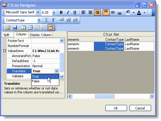 - Click the ellipsis button next to the Columns property of C1List1 in the Properties window. This will bring up the C1List Designer. Select ContactType in the right pane, and in the left pane expand the ValueItems property. Set the Translate property to True.