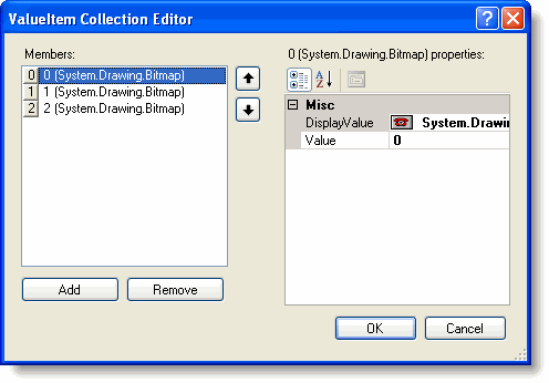 - Click the ellipsis button next to the Values property and the ValueItem Collection Editor appears. Click the Add button and the first ValueItem member appears in the left pane. In the right pane enter 0 in the Value box. For the DisplayValue, click the ellipsis button and find the phone.bmp file that came with this tutorial. Click Open and a phone icon appears next to the DisplayValue.