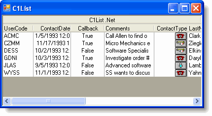 In the ContactType column C1List1 displays the icons that you entered as DisplayValues in the ValueItem Collection Editor. Setting the Translate property to True displays the DisplayValues instead of the data values entered for the Value property.