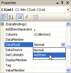 In AddItem mode, you can modify a list manually. The application supplies and maintains the data. Tutorial 3 - AddItem Mode shows how to use the AddItem, RemoveItem and ClearItems methods, and Tutorial 21 - Design-Time Support for C1Combo's AddItem Mode shows you how to use the C1List Designer to use AddItem mode. This section will expand on the tutorials and show you how to use the InsertItem, AddItemTitles, and SetAddItemData methods, as well as the AddItemSeparator and AddItemCols properties.