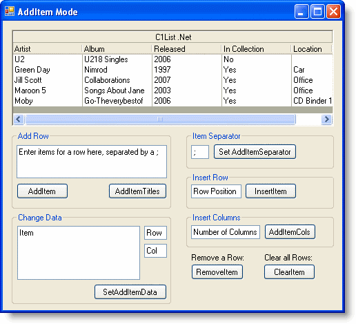 The following picture uses the AddItem mode methods and properties that will be discussed in the following sections. The AddItem, RemoveItem, and ClearItems methods are discussed in Tutorial 3 - AddItem Mode, as well as in List for WinForms' AddItem Mode.