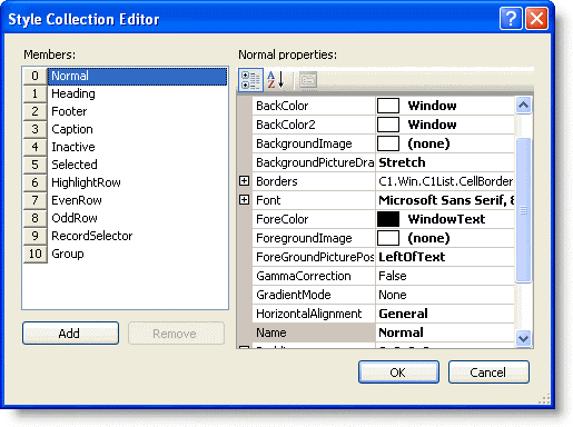 In order to make these properties more easily modifiable, the Style Collection Editor enables the user to add styles and modify the properties of existing styles. The Style Collection Editor is available in the Properties window. Clicking the ellipsis button next to the Styles node in the Properties window will bring up the editor.