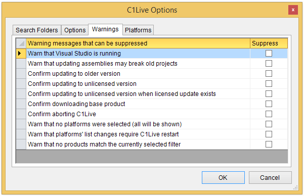 Select the Suppress check box to suppress any of the listed warnings so they no longer appear. The following warning messages can be suppressed: