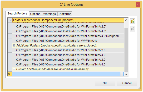 The C1Live Options dialog box can be accessed by selecting File | Options in ComponentOne Studio Live. The C1Live Options dialog box includes four tabs: Search Folders, Options, Warnings, and Platforms. For more information about the options, see the following topics.