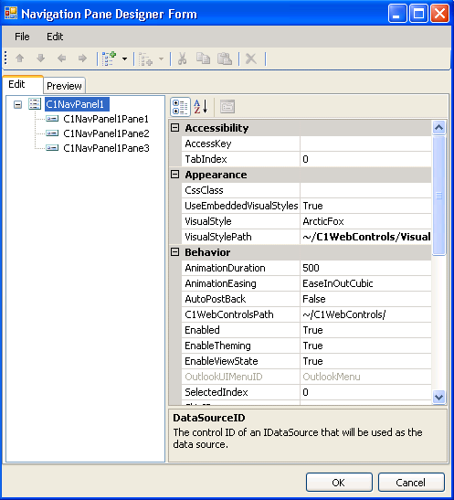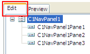 Click the Edit tab and select the C1NavPanel control or the desired C1NavPanelPane for which you would like to manipulate or adjust the properties.