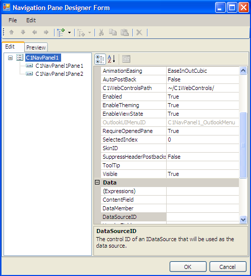 5. Since you edited the Tasks pane last, it is still selected. Select the ComponentOne Web Site pane so that its contents will appear first in the content area of the C1NavPanel when the project runs.