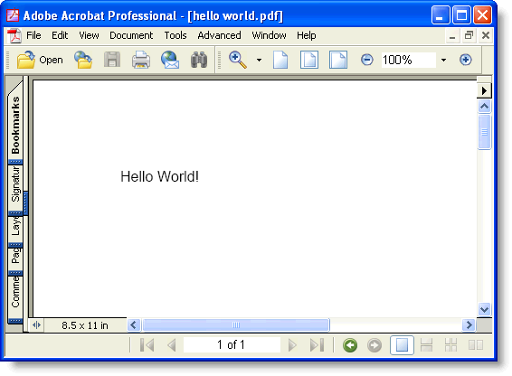 After the application is run, the hello world.pdf document will look like this:
