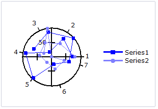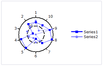 Polar chart: A Polar chart draws the x and y coordinates in each series as (theta,r), where theta is amount of rotation from the origin and r is the distance from the origin. Theta may be specified in either degrees (default) or radians. Since the X-axis is a circle, the X-axis maximum and minimum values are fixed. The series can be drawn independently, or stacked. Polar charts can be further customized; see Chart Properties for more information.