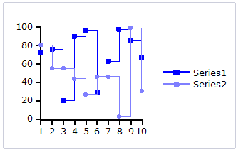 Step chart: A Step chart is a form of XY plot chart that draws series as connected points of data. These charts are often used when Y values change by discret amounts, at specific values of X with a sudden change of value. A simple, everyday example would be a plot of a checkbook balance with time. As each deposit is made, and each check is written, the balance (Y value) of the check register changes suddenly, rather than gradually, as time passes (X value). During the time that no deposits are made, or checks written, the balance (Y value) remains constant as time passes.