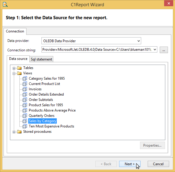 To create a new report with an embedded chart, use the C1Report Wizard and complete the following steps: