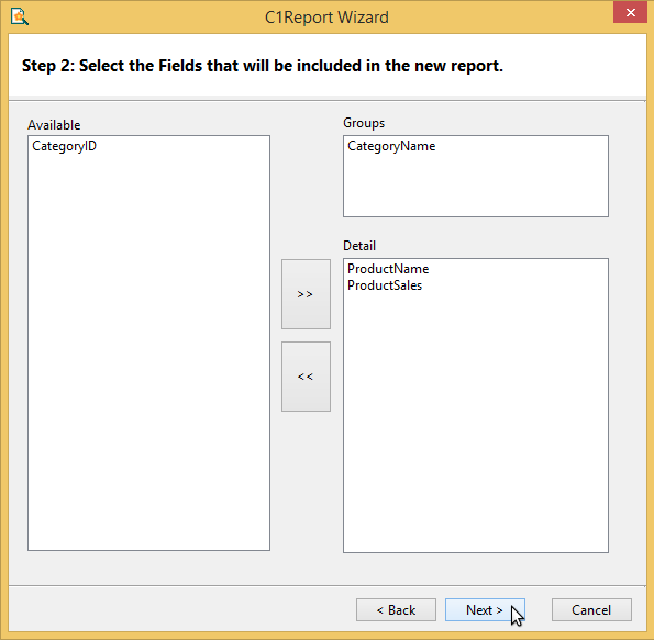 This example groups the data by Category and shows ProductName and ProductSales in the Detail section of the report. To add groups and detail fields, with your mouse pointer drag them from the Available list on the left to the Groups or Detail lists on the right: