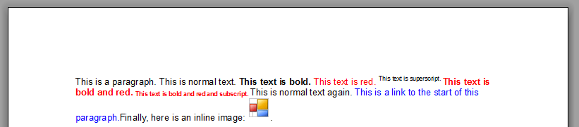 The content of a paragraph is comprised of ParagraphObject objects. ParagraphObject is the abstract base class; the two inherited classes are ParagraphText and ParagraphImage, representing fragments of text and inline images, correspondingly. You can fill a paragraph with content by creating objects of those two types and adding them to the RenderParagraph.Content collection. Various constructor overloads and properties are provided for convenient creation/setup of those objects. In-paragraph hyperlinks can be created by specifying the Hyperlink property of the paragraph object which should be a hyperlink. An alternative approach is to use various overloads of the shortcut methods AddText, AddImage and AddHyperlink, as shown in the following example: