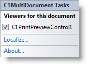 If any visual previewing controls such as C1PrintPreviewControl control are included in the application, the C1MultiDocument Tasks Menu will display them here. When the check box next to the name of a previewing control is checked, the C1MultiDocument component is associated with the previewing control and reports will appear in the previewing control.
