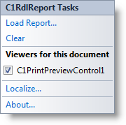 If any visual previewing controls such as C1PrintPreviewControl control are included in the application, the C1RdlReport Tasks Menu will display them here. When the check box next to the name of a previewing control is checked, the C1RdlReport control is associated with the previewing control and reports will appear in the previewing control.
