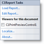 In Visual Studio, the C1Report component includes a smart tag. A smart tag represents a short-cut tasks menu that provides the most commonly used properties.