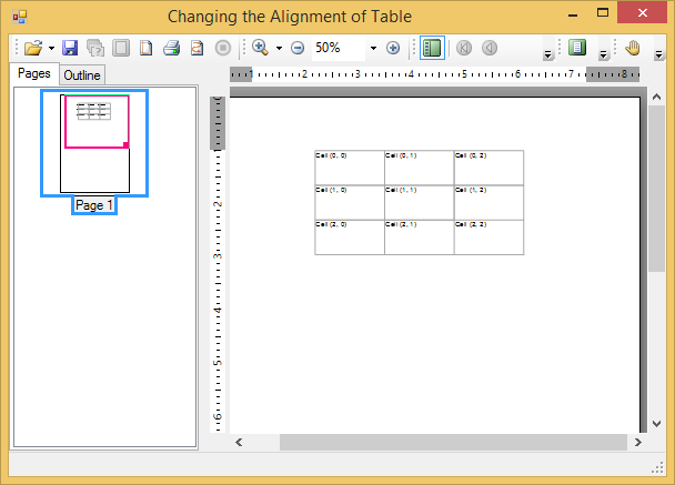 To change the alignment of a table, set the FlowAlign property for the table. For example, add the following code to the Form_Load event before the Generate method to center the table on the page: