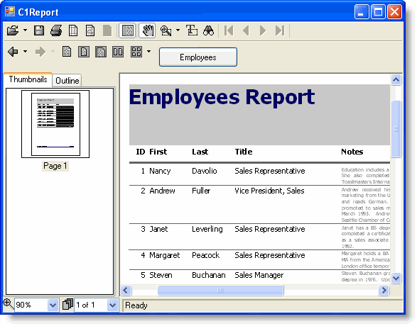 RenderEmployees() ' render the report into the C1PrintPreview control ppv.Document = c1r |