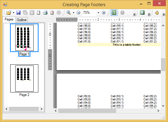 // Add table footer text. rt1.Cells[rt1.Rows.Count - 2, 0].SpanRows = 2; rt1.Cells[rt1.Rows.Count - 2, 0].SpanCols = rt1.Cols.Count - 1; rt1.Cells[rt1.Rows.Count - 2, 0].Style.TextAlignHorz = C1.C1Preview.AlignHorzEnum.Center; rt1.Cells[rt1.Rows.Count - 2, 0].Style.TextAlignVert = C1.C1Preview.AlignVertEnum.Center; ((C1.C1Preview.RenderText)rt1.Cells[rt1.Rows.Count - 2, 0].RenderObject).Text = "This is a table footer."; // Add page numbers. rt1.Cells[rt1.Rows.Count - 2, 3].SpanRows = 2; rt1.Cells[rt1.Rows.Count - 2, 3].Style.TextAlignHorz = C1.C1Preview.AlignHorzEnum.Right; rt1.Cells[rt1.Rows.Count - 2, 3].Style.TextAlignVert = C1.C1Preview.AlignVertEnum.Center; // Tags (such as page no/page count) can be inserted anywhere in the document. ((C1.C1Preview.RenderText)rt1.Cells[rt1.Rows.Count - 2, 3].RenderObject).Text = "Page [PageNo] of [PageCount]"; this.c1PrintDocument1.Generate(); |