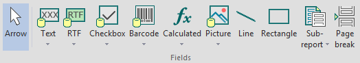 The Fields group in the C1ReportDesigner's Insert tab allows you to easily add fields to your report. For button descriptions, see Enhancing the Report with Fields.