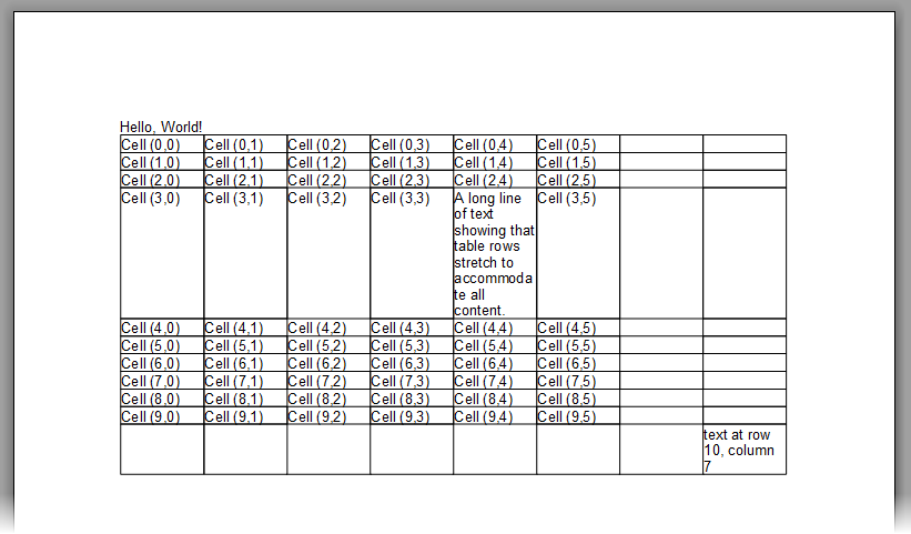 rt.Cells[3, 4].Text = "A long line of text showing that table rows " + "stretch to accommodate all content.";